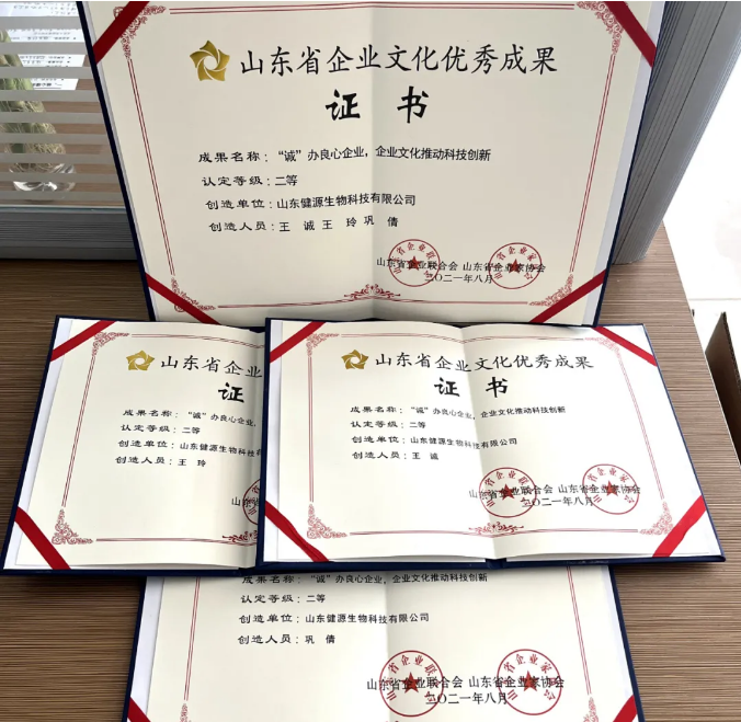 2021年8月,山東省企業聯合會、山東省企業家協會發布《關于公布首屆山東省企業文化優秀成果的通知》,山東健源生物科技有限公司報送的““誠”辦良心企業,企業文化推動科技創新”企業文化建設成果榮獲首屆山東省企業文化優秀成果二等獎。