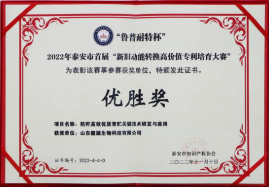 祝賀山東健源生物榮獲2022年泰安市首屆“新舊動能轉換高價值專利培育大賽”優勝獎