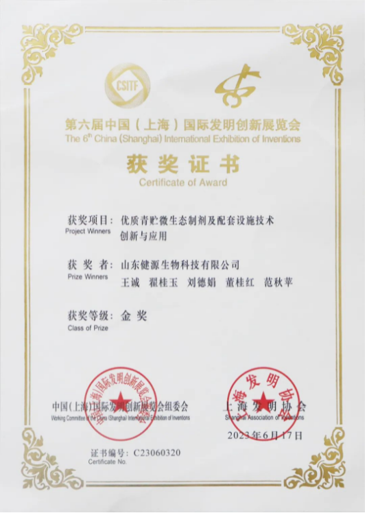 2023年6月17日,第六屆中國(上海)國際發明創新展覽會圓滿閉幕,頒獎典禮在上海世博館隆重舉行,山東健源生物科技有限公司《優質青貯微生態制劑及配套設施技術創新與應用》項目榮獲第六屆中國(上海)國際發明創新展覽會金獎。