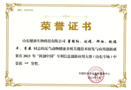 山東健源生物科技有限公司《反芻動物健康養殖關鍵技術研發與應用》項目榮獲2023年科創中國專利信息創新應用大賽(山東專場)一等獎
