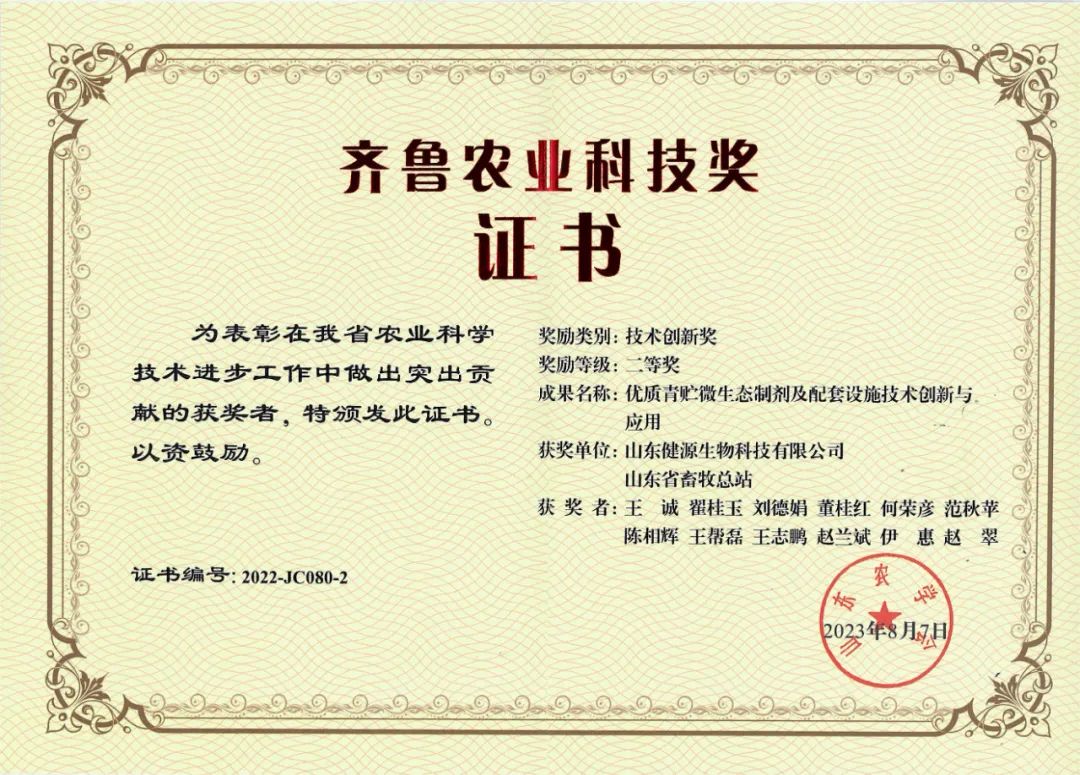 山東健源生物科技有限公司作為第一完成單位申報的“優質青貯微生態制劑及配套設施技術創新與應用”項目榮獲2022年度齊魯農業科技獎技術創新獎二等獎。