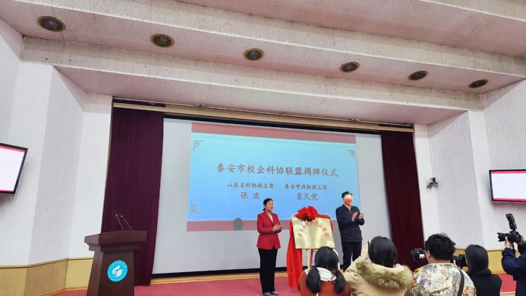 山東省科協副主席張波和泰安市政協副主席袁久黨為“泰安市校企科協聯盟”揭牌