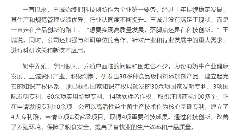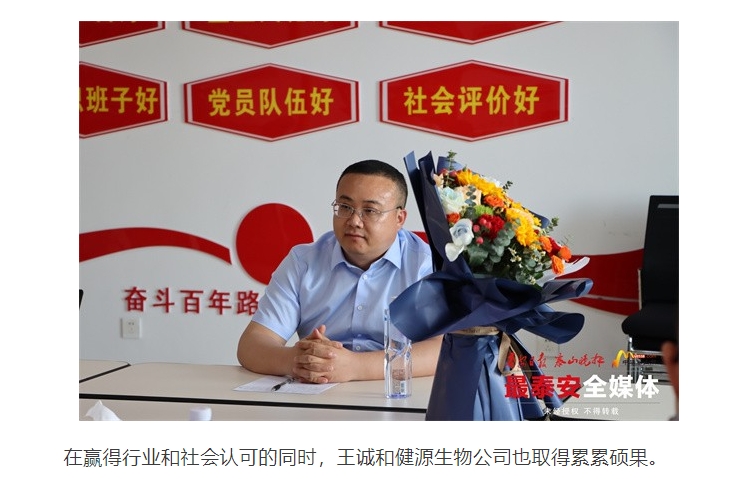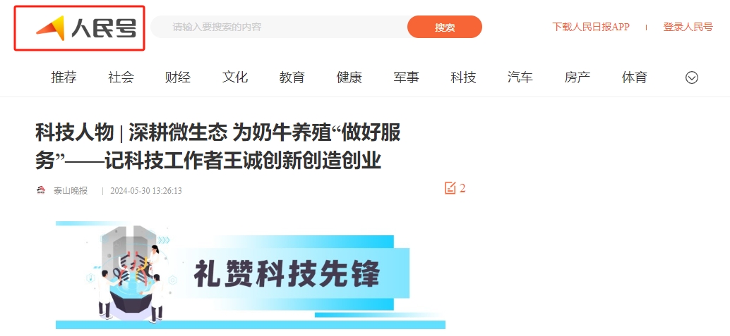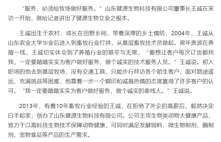 2024年5月30日迎來了第八個全國科技工作者日,山東健源生物科技有限公司董事長王誠作為泰安市科協推選的科技工作者代表接受了泰安日報記者的采訪。《深耕微生態,為奶牛養殖“做好服務”——記科技工作者王誠創新創造創業之路》報道在人民日報、人民號、今日頭條、泰山晚報、最泰安全媒體等多家新聞平臺發布。