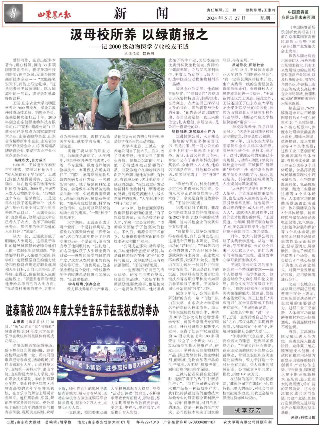 發布時間:[2024-6-1 17:23:41] 瀏覽量:2844次日前,王誠董事長作為山東農業大學校友接受《山東農大報》桃李芬芳欄目采訪。報道發表在《山東農大報》第1447期第8版,講述了王誠董事長求學創業之路,以實際行動反哺母校,先后被山東農業大學聘為“創新創業導師”和“研究生校外行業導師”,擔任山東畜牧獸醫學會副理事長、山東畜牧獸醫學會反芻動物科技專業委員會秘書長、副理事長。2023年被聘請為山東農業大學校友會泰安聯絡處理事會秘書長,并被授予“優秀校友工作者”榮譽稱號,健源生物是山東農業大學“校友之家”單位、動物科技學院“教育科研實踐就業基地”。