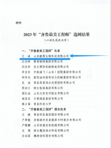 發布時間:[2024-7-5 15:51:56] 瀏覽量:3005次近日,山東省工程師協會下發關于授予2023年度“齊魯最美工程師”榮譽稱號的通報,山東健源生物科技有限公司董事長王誠被授予2023年度“齊魯最美工程師”榮譽稱號。