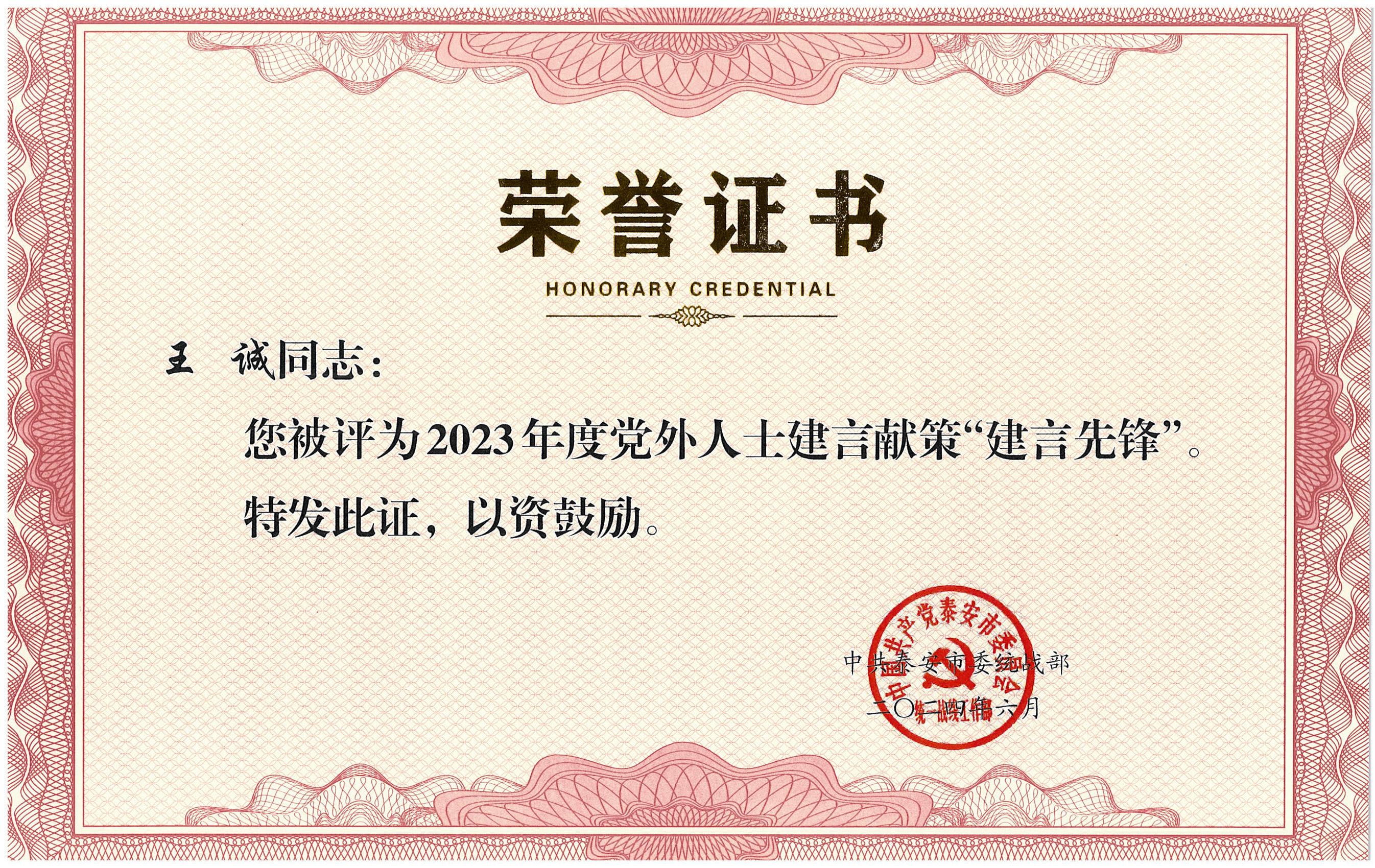 王誠董事長榮獲中共泰安市委統戰部多項榮譽