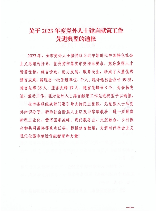 發布時間:[2024-7-9 17:52:5] 瀏覽量:3332次會上公布了《關于2023年度黨外人士建言獻策工作先進典型的通報》,王誠董事長被評為2023年度黨外人士建言獻策“建言先鋒”,撰寫的《關于加強泰安市黃河流域地區土壤修復推進農業高質量發展的建議》被評為2023年度黨外人士建言獻策“金點子”。