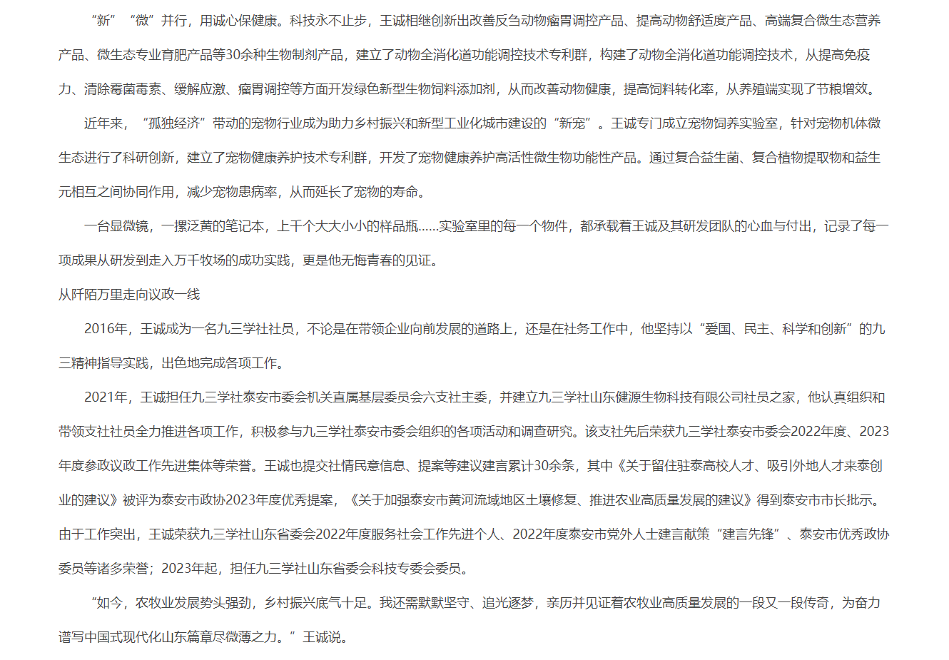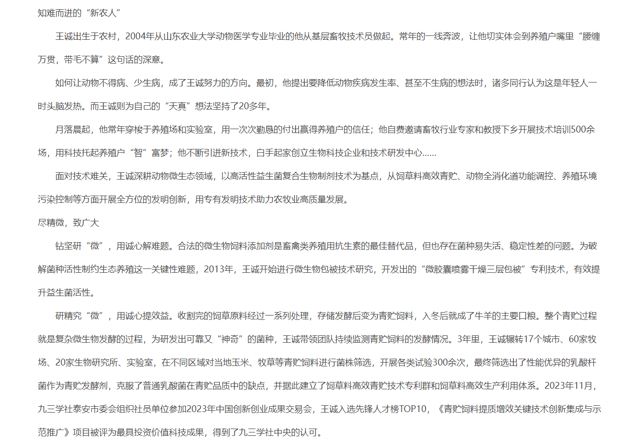 發布時間:[2024-8-7 15:16:1] 瀏覽量:3307次近日,中國人民政治協商會議山東省委員會官網推送《“微”而不凡的 科技“新農人”》文章,報道山東健源生物科技有限公司董事長王誠作為“新農人”,20多年來深耕微生態領域,以高活動性益生菌復合生物制劑技術為基點,從飼草料高效青貯、動物全消化道功能調控、養殖環境污染控制等方面全方位的發明創新,用專有發明技術助力農牧業高質量發展。而作為一名九三學社社員,王誠董事長堅持以“愛國、民主、科學和創新”的九三精神指導實踐,出色地完成各項工作。全文如下: