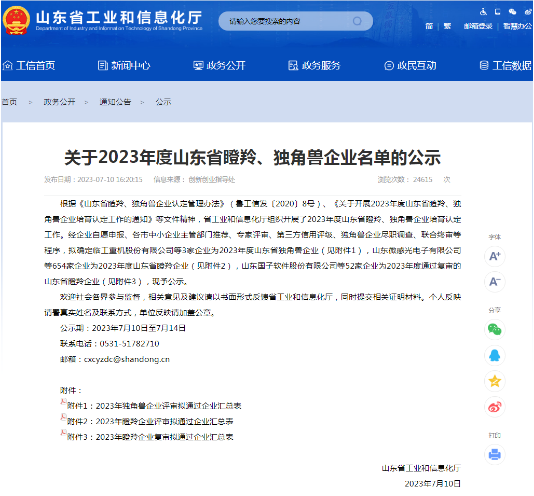 2023-7-14 山東健源生物被認定為2023年度山東省瞪羚企業