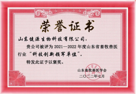 祝賀山東健源生物被評為2021-2022年度山東省畜牧獸醫(yī)行業(yè)“科技創(chuàng)新領(lǐng)軍單位”