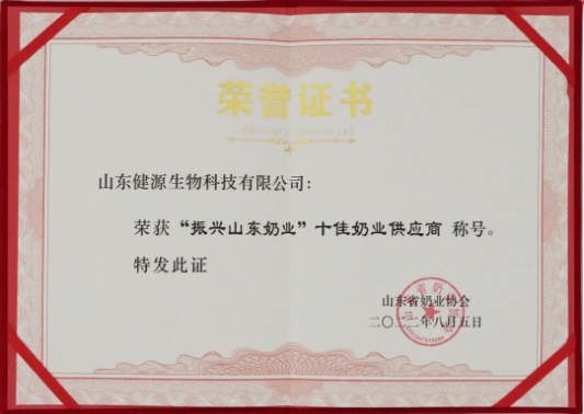 山東健源生物科技有限公司榮獲“振興山東奶業”十佳奶業供應商 稱號