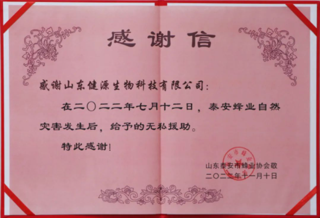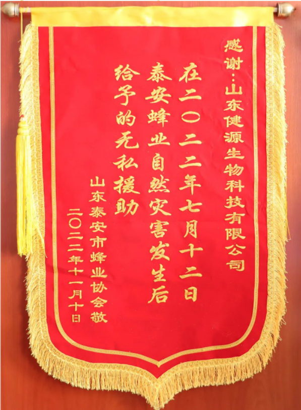 2023年4月11日,山東健源生物科技有限公司收到來自山東泰安市蜂業協會的一封感謝信和一面錦旗,感謝山東健源生物在2022年7月12日,泰安蜂業自然災害發生后,給予的無私援助。